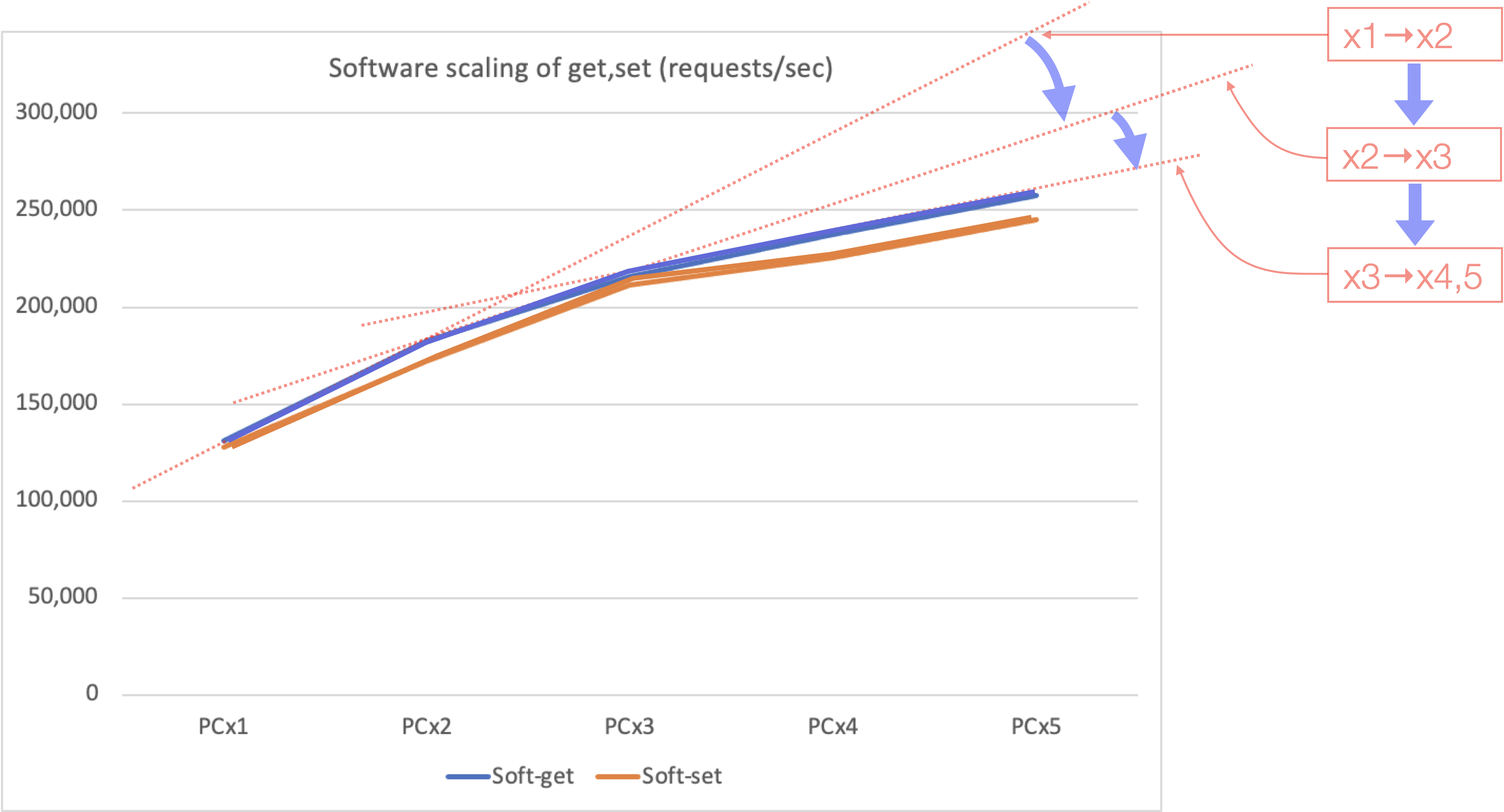 The horizontal axis is the number of clients. The vertical axis is requests/sec. You can see that the number of requests increases as the number of units goes up. Note the angle is gradually getting down. An approximation line is shown below as an assistance.