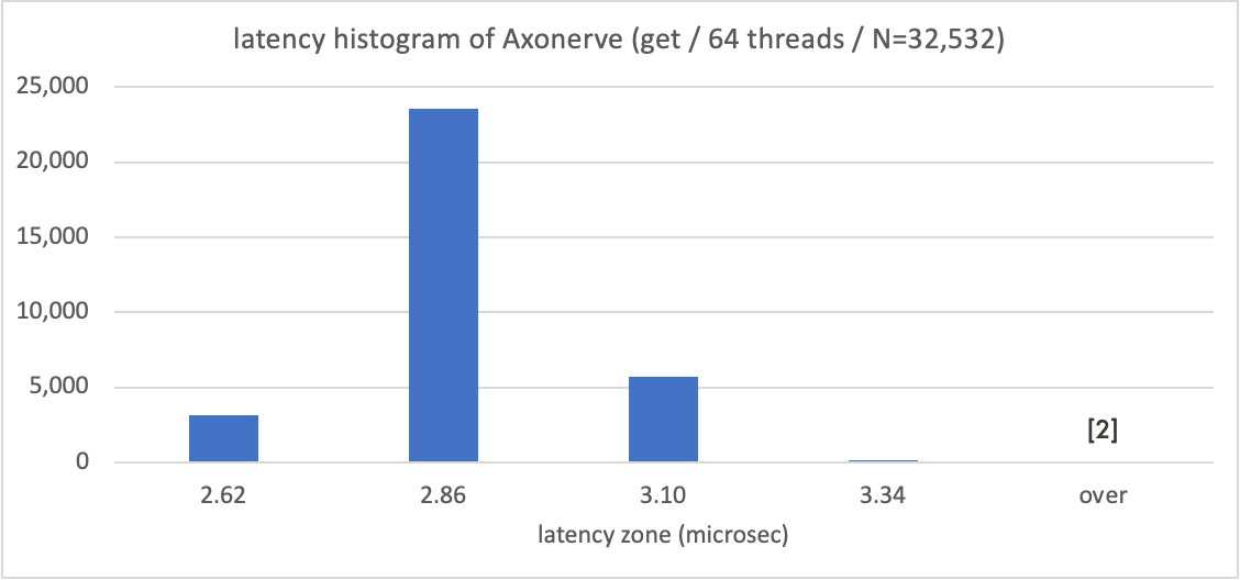 The following graph shows a histogram of Axonerve Server, with microseconds on the horizontal axis. Axonerve server responds in around 3 microseconds, which is also an order of magnitude faster than the Software Server.